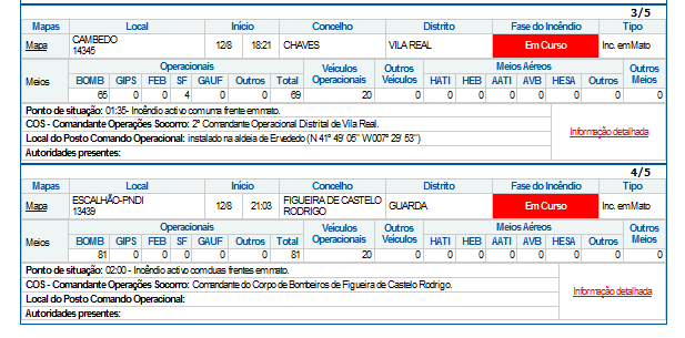 Ao fecho desta edição, os Bombeiros de Salvação Pública estavam a ajudar as populações a saírem em segurança das casas e tentavam a todo o custo que as chamas, que já tinham destruído uma casa e um anexo, avançassem pelo interior das duas aldeias, com mais de 950 habitantes. A corporação de Chaves contava já com a ajuda de alguns bombeiros espanhóis, que combatiam as chamas do outro lado da fronteira, e aguardava a chegada de mais meios, de forma a que o incêndio fosse controlado.