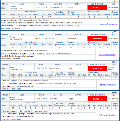 Até às 18h00, foram registados 244 fogos, dos quais 34 deles ainda activos. Dos 12 que o site da ANPC destaca três localizam-se em Braga, dois no Porto e dois em Viseu. Há ainda ocorrências em Bragança, Aveiro, Viana do Castelo, Leiria e Coimbra, todas elas deflagradas já depois do final da manhã. Só a combater o fogo de Penela há 303 operacionais e 77 veículos, numa ocorrência que teve início perto do meio-dia e que levou ao corte, durante a tarde, de um troço do IC3, forçando os condutores a seguir, como alternativa, uma estrada de Miranda do Corvo.