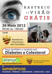 CONVITE A VISITAR Convidamos todos os nosso amigos e conhecidos e amigos dos amigos assim como vizinhos dos amigos dos amigos, resumindo, estão todos convidados :)) Próximo dia 26 de maio teremos nas nossas instalações vários rastreios tais como; de visão, aos diabetes e colesterol. Esta acção, é efectuada pela "Super Oticas " e pela Farmácia Aliança, ambas as empresas cediadas nos Carvalhos. Fonte: BV dos Carvalhos