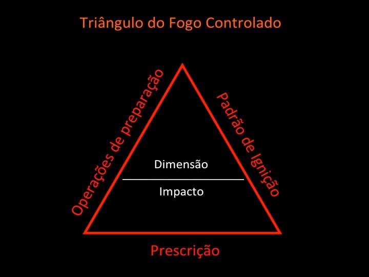 Cada lado do triângulo representa um dos elementos que assegura o "controlo", o qual se exerce sobre a dimensão do fogo (a área pré-definida de tratamento) e o seu impacte (ou severidade).
