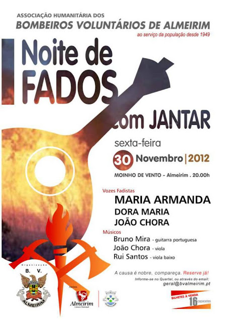 Vai decorrer no próximo dia 30 de Novembro, sexta-feira, pelas 20h00 no Salão Moinho de Vento mais uma Noite de Fados com Jantar para angariação de Fundos para os Bombeiros Voluntários de Almeirim.