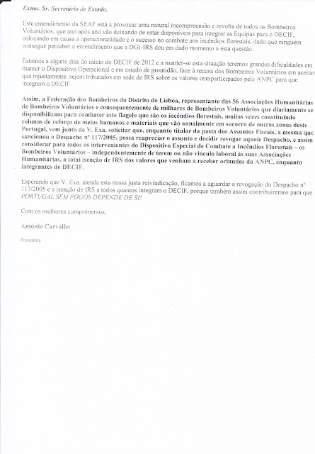 Em carta dirigida ao senhor Secretário de estado dos Assuntos Fiscais, Dr. Paulo Núncio, a Federação dos bombeiros do Distrito de Lisboa, argumenta que às associações de Bombeiros são meros intermediários entre a ANPC e os operacionais, acusa de serem usadas como, barrigas de aluguer pela ANPC, e alertam que o Despacho 117/2005 não venha ser alterado irá existir grande dificuldade de manter o DECIF em 2013.