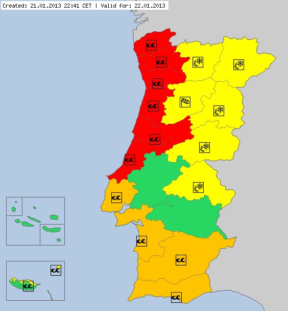 | Amarelo | Vento | Nas terras altas vento forte de noroeste com rajadas da ordem dos 90 km h |