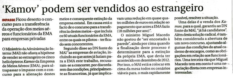 1. Na sequência da já longa novela do concurso público internacional para a privatização da operação dos meios aéreos propriedade do Estado Português, Kamov e Ecureuil pagos com o dinheiro dos contribuintes, por diversas vezes o Sr. Ministro da Administração Interna, Dr. Miguel Macedo, frisou no Parlamento que estes helicópteros manter-se-iam na propriedade do Estado. Foi também afirmado inequivocamente, tendo sido até tecidas comparações com os funcionários dos extintos Governos Civis, que o futuro dos agora cerca de 50 trabalhadores da EMA estaria assegurado;